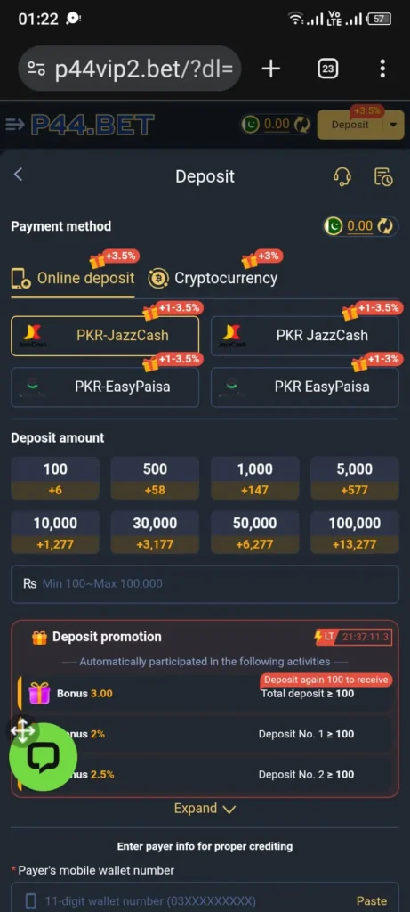 Depositing money in P44 Bet Game is a simple and quick process. First, open the app and log in to your account, then go to the Wallet or Deposit section. Choose a local payment method such as JazzCash, EasyPaisa, or Bank Transfer, enter the amount you want to add, and confirm the payment by following the on-screen instructions. In most cases, the deposited amount appears in your P44 Bet Application balance within a few minutes, allowing you to start playing Teen Patti or other casino games without delay.